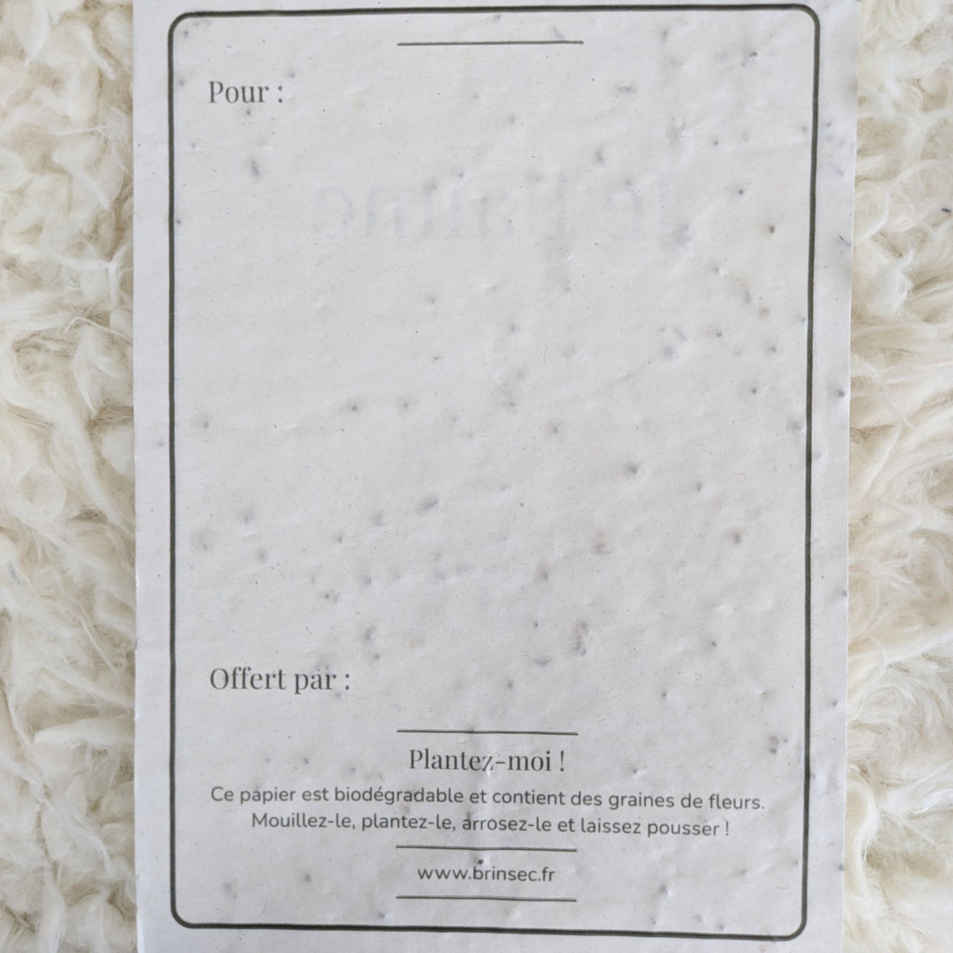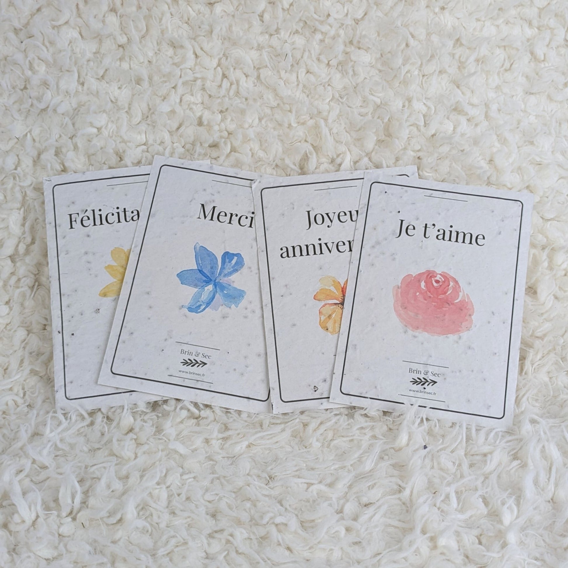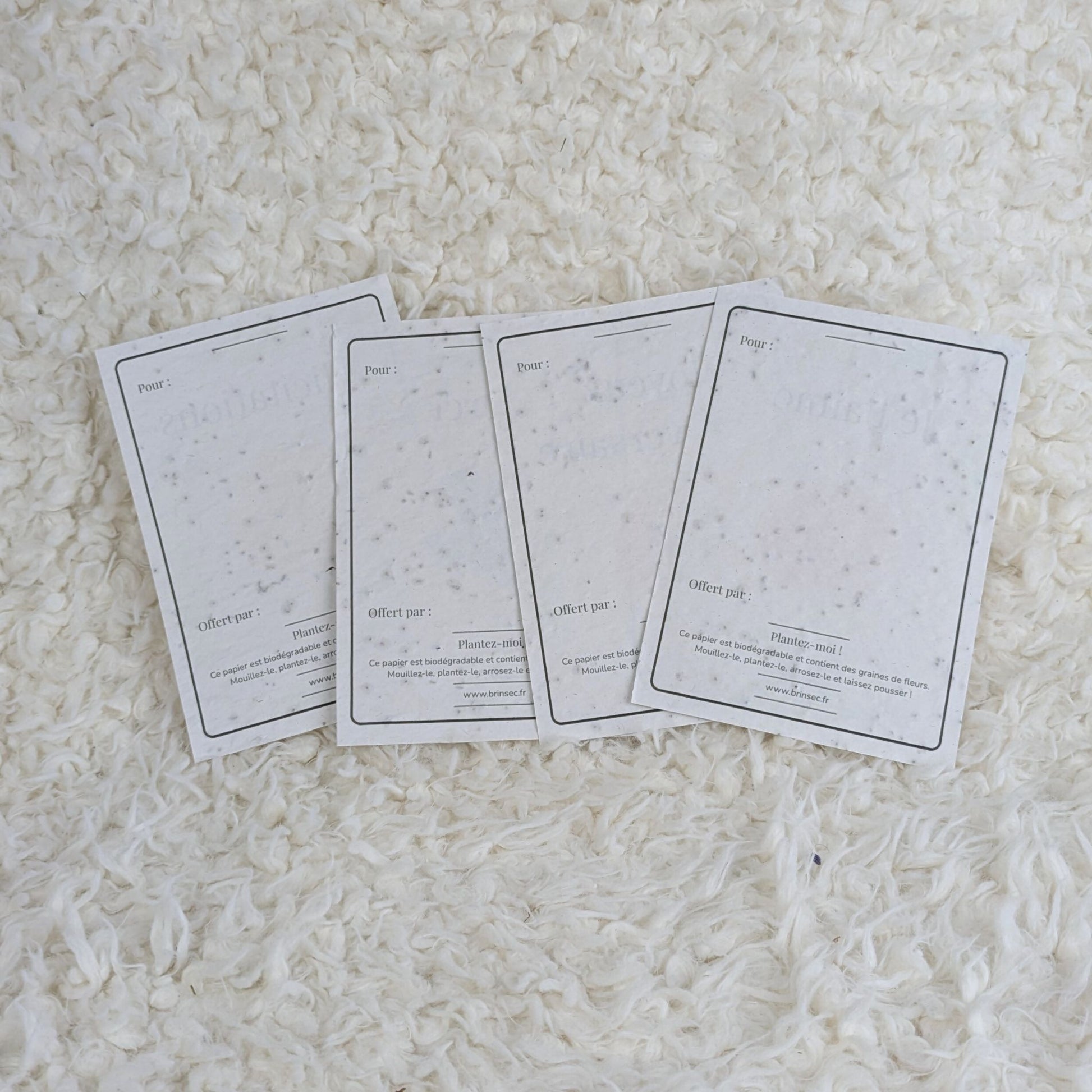 Chaque mot déposé sur ces cartes en papier ensemencé se transforme en promesse : une fois mises en terre, elles donnent naissance à de jolies fleurs.