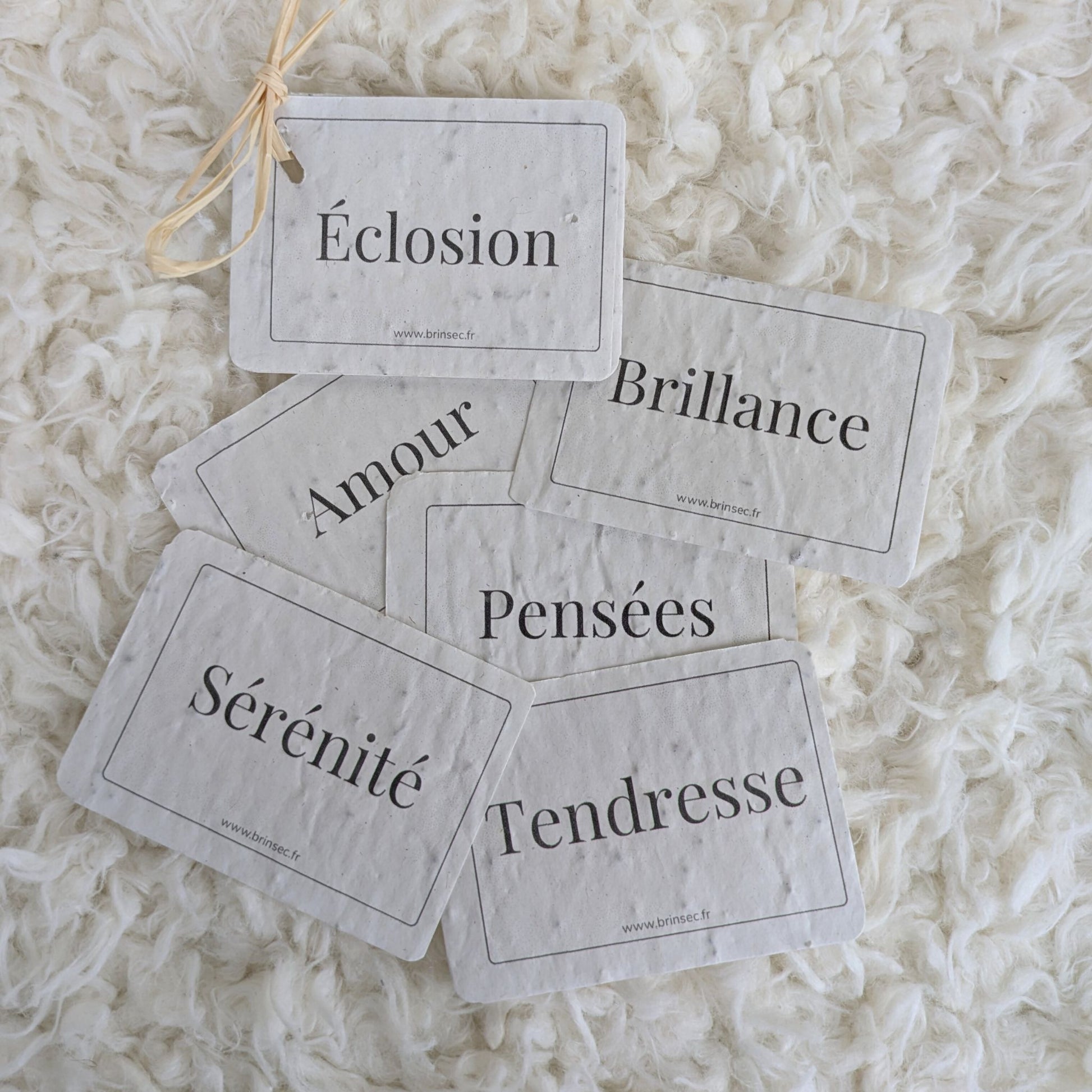 Chaque mot déposé sur ces mini-cartes en papier ensemencé se transforme en promesse : une fois mises en terre, elles donnent naissance à de jolies fleurs.